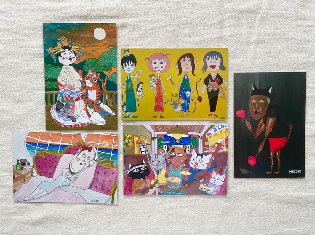 ・# 170『とあるスナックの開店前』 ・#142『猫の町の床屋の提携してるドーナツを食べる人達』 ・# 253『辰から巳~脱皮~』 ・# 160『Cats FRENCH CAN CAN』 ・# 249『猫背家族』 ポストカード5枚です。 ※画像と実物では、色味が異なって見える場合がありますので、あらかじめご了承ください。
